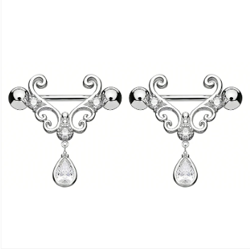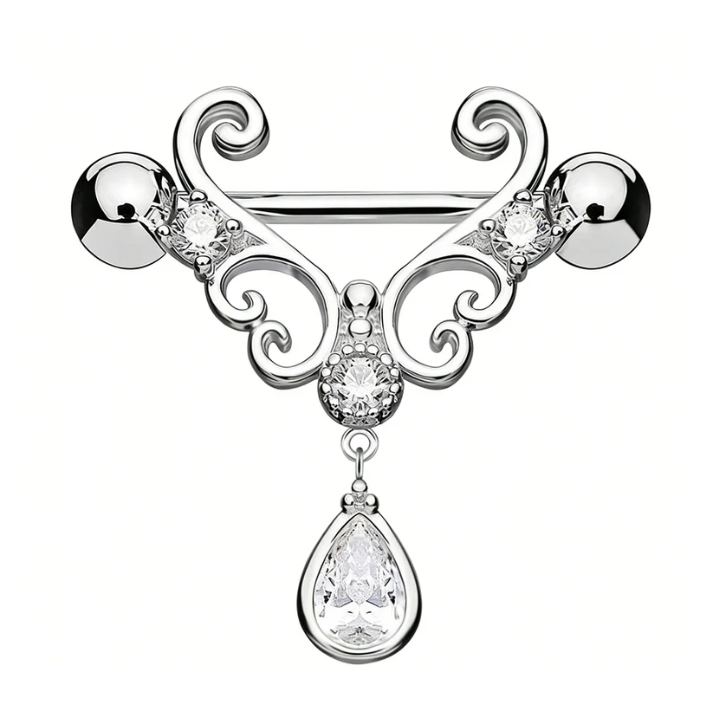 Elevate your body art with this exquisitely crafted nipple shield. Featuring an intricate vintage-inspired filigree design, this piece is centered with a shimmering crystal and finished with an elegant tear-drop dangle that moves with you. Perfect for adding a touch of Victorian-era glamour to your collection, this jewelry is designed for both comfort and a striking aesthetic.